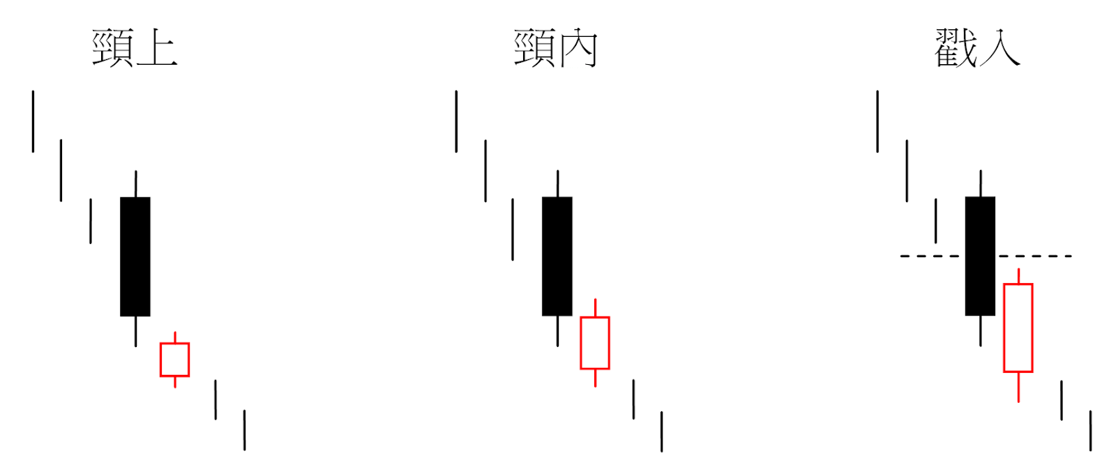 ?貫穿型態的長紅K線實體「必須」高於黑K線實體的一半以上(烏雲罩頂則可有保留一些彈性)。因為若沒有達50%以上時,另有三種相似的連續型態都屬於空頭訊號:頸上(on-neck)、頸內(in-neck)及戳入(thrusting)等。基本上,頸上、頸內及戳入可參考其他技術指標再做論斷,保守投資人可在收盤價跌破5日均線時再行賣出。
